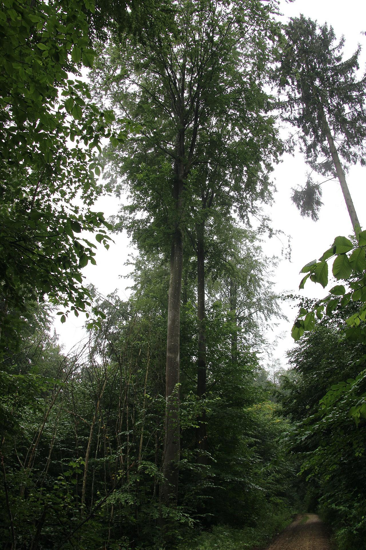 Der Nadelbaum neben dem Weg sticht zwischen all den Buchen, Eichen und Eschen sofort ins Auge. Doch um welchen Nadelbaum handelt es sich?
