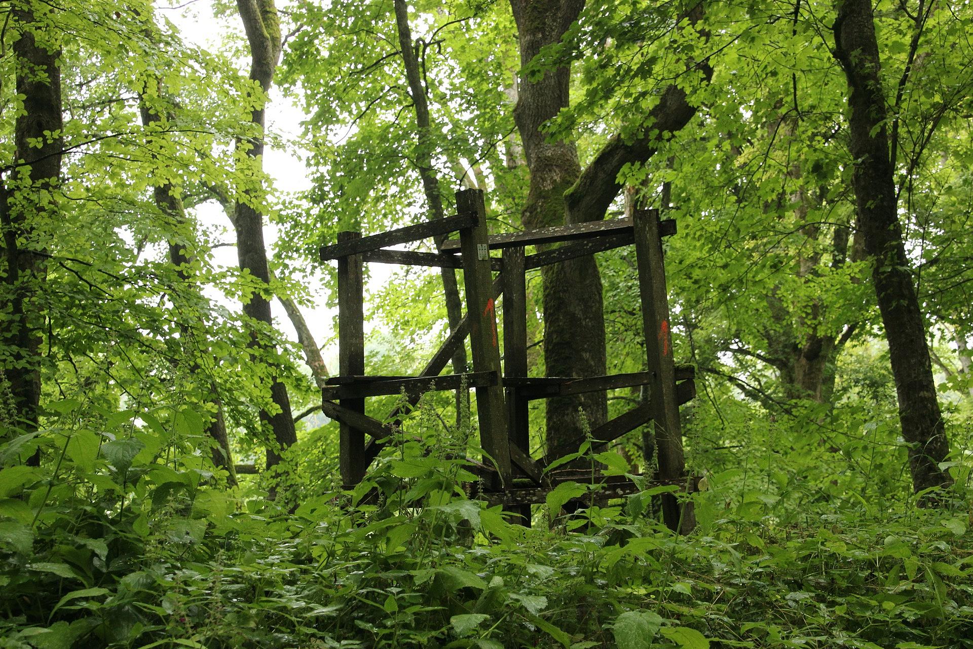 Das Holzgestell neben dem Weg ist eine besondere Form des Hochsitzes: ein sogenannter Drückjagdstand. Hochsitz nicht beteten, dieser ist ausschließlich für jagdliche Nutzung. Er wird, wie der Name unschwer erkennen lässt, auf Drückjagden verwendet und ist so konstruiert, dass die Jäger möglichst viel Bewegungsfreiheit und ein weites Schussfeld haben. Warum die Jagd auch in Naturwäldern eine wichtige Rolle spielt, erfahren Sie hier: